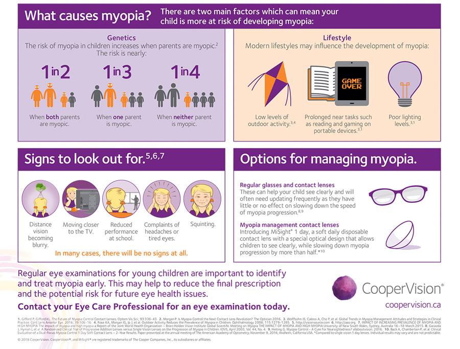 Your child’s doctor may prescribe long-acting dilating eye drops to help reduce overfocusing, which contributes to myopia progression. They may prescribe a different type of contact lens (a rigid gas permeable lens) that is capable of reshaping the cornea and worn at night. This treatment option is called Ortho-Keratology (Ortho-K). It is also advisable for children to spend at least 2 hours daily outdoors, limit screen time, use blue light protection during screen time, and keep a reasonable distance between their eyes and their reading material. Finally, following the 20-20-20 Rule : after 20 minutes of reading, focus on an object at least 20 feet away for at least 20 seconds, may also be a way to help slow myopic progression.